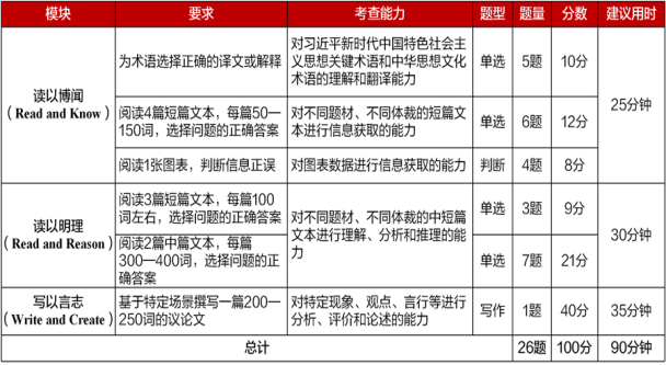 综合能力测试全国统一线上初赛赛题由大赛组委会提供,包括客观题若干道和议论文写作1篇,具体构成如下。