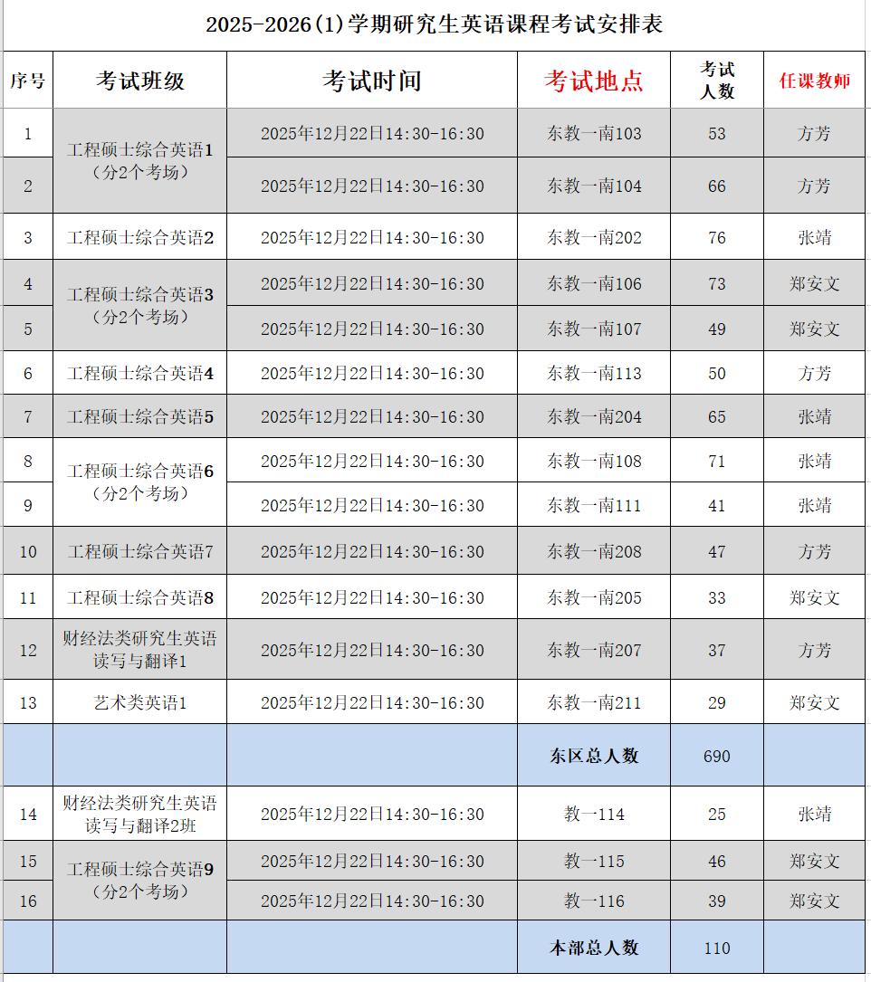各学院、2025级相关研究生: 2025-2026(1)学期研究生英语课程考试定于2025年12月22日14:30-16:30进行,请相关研究生带好考试用品,严格按照《bwin必赢线路检测研究生课程考试考场规则》的要求持有效证件准时到达指定考场参加考试。具体考场名单安排见附件。