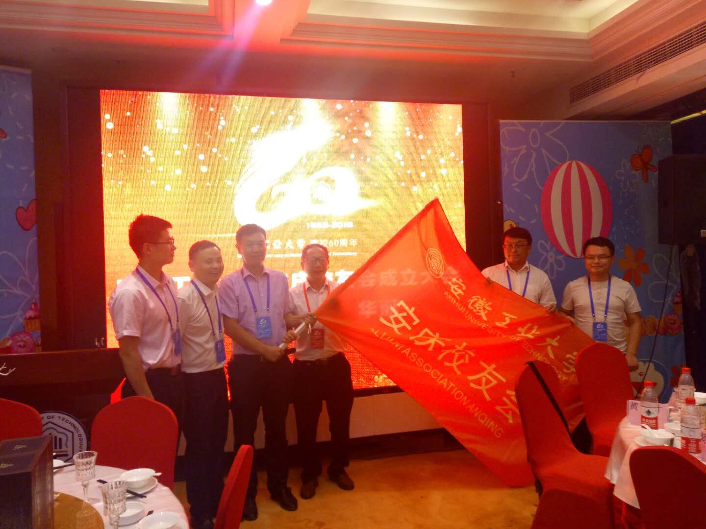 葛芦生向安庆校友会授会旗。校友总会常务理事、商学院党委书记黄国才宣读了学校关于同意成立安庆校友会组织机构的批复。