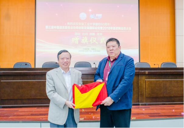 在大会闭幕式上,祖明代表学校接受了下一届承办单位负责人——国家外文局培训中心翻译部主任、贵州墨责国际文化传播有限公司林凡林总经理赠送的珍贵礼物,2018年9月23日天安门广场升起的国旗。并见证了语资网向我校76net必赢线路检测中心学生篮球队、排球队捐赠队服和篮球、排球仪式,以及向大会志愿者颁证颁奖活动。