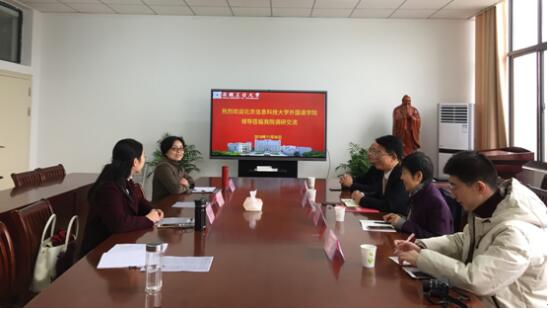 曹瑞斓对张广奇一行来学院交流表示欢迎,她简要介绍了学院的发展历程、专业与学科现状、科研与社会服务和实验室平台建设等情况,详细介绍我校翻译本科专业、商务英语研究二级硕士点和翻译专业硕士点申报和建设的经验和做法。陈琳介绍了翻译本科专业培养目标、课程结构和专业特色等情况。张广奇感谢学院的热情接待,表示将认真学习和研究学院的宝贵经验。