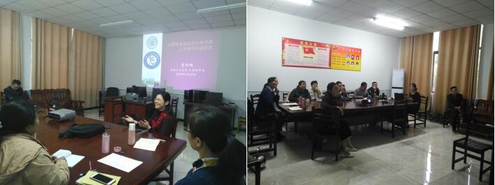 曹瑞斓教授作了题为《以国学双语活动为依托的人才培养实践探索》的精彩而详实的报告。她首先梳理了目前我院已经开展的丰富多彩的国学双语活动,例如学生暑期双语经典诵读、北京国际书展推介会上的国学经典双语诵读汇报、语资网大会晚宴上的双语朗诵展演、马鞍山文化景点旅游双语推介和宣传等等。她认为,教师通过组织和参与国学双语活动,并密切结合自己的课程教学,可以极大地提升学生的基本专业素养以及团队合作、研究探索、书面和口头表达等各项能力;教师还可通过申请加入国学双语研究会等学术组织的方式进一步拓宽学术平台和视野。在随后的讨论环节,参会老师一致认为,曹瑞斓教授用丰富的例子阐述了教师的自我培养与学生的人才培养密切融合对于国学双语研究的促进作用,对于今后学生培养、科研工作的开展和国学经典传播都颇有启发意义。