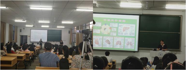 首先,主题报告人戴林老师从跨文化角度阐述了中医针灸学的英译原则研究。戴老师现场不仅图文并茂地向大家介绍了中医五行的知识,同时亲自示范讲解针灸学里“寸”字的四种含义,引得现场老师和同学们跃跃欲试,纷纷给自己把起了脉。报告中,戴老师通过文献综述总结出中医针灸学的跨文化英译应充分考虑文化差异,了解针灸学术语的传统哲学、文学和宗教色彩并尊重原文,亲近读者等原则。紧接着戴老师给出拼音音译加英文注释等中医针灸学的跨文化传播策略,她最后总结道,中医针灸学的英译过程涉及的主要是术语的英译。把术语的表面含义及内在的文化含义精准无误地传达给国外爱好者或者是从业人员,是英译中最难也是最重要的部分。戴老师的主题报告结束后,曹瑞斓老师进行了简短的小结,重申了中国传统中医对生活的重要性和对中医在世界范围内服务人类命运共同体的重要性。