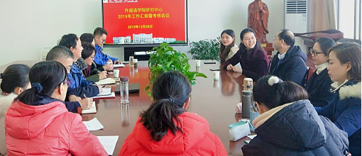 翻译研究中心主任戴俊霞、商务英语研究中心主任蒯振华、国学双语研究中心主任于春莉、文学文化研究中心教师代表刘菱馨、语言学研究中心教师代表吴然菊、学生代表梁文静分别就这5个研究中心在2019年度所做的工作、取得的成果、面临的问题以及下一步发展方向等进行了总结汇报。