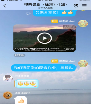 在学生无教材的情况下,课程组要求学生下载“外研随身学”APP,进行英语视听训练,每单元都布置了一定的视频音频学习任务。每单元都设计主题讨论,每周完成一次听力网测。由于线上教学无法像线下教学那样进行英语口语训练,课程组要求每位学生提交形式多样的录音作业。比如,录音回答问题、跟读模仿著名英语诗歌、为最新网红英语演讲视频配音。绝大多数同学对这些学习任务感到耳目一新,但同时也感觉到极具挑战(尤其是视频配音)。尽管如此,学生们还是兴趣盎然,跃跃欲试,克服困难,提交作业。在作业完成过程中,师生之间以及生生之间通过QQ群相互交流有关技术操作、英语发音困难及节奏处理等问题。任课老师一份份作业认真倾听批阅,并给予同学个性化点评指导。另外,将学生优秀作品在QQ群里分享,增强学生自信心和成就感,同时也激发了更多同学的英语学习兴趣。在班级QQ群里,课程组老师及时推荐并上传一些学生感兴趣的或有关时事的英语视频、音频和文章,作为课外补充材料,并以问卷、测验、抢答的形式来检查自学情况。在平台群聊和班级QQ群里,任课老师随时回复同学提问。