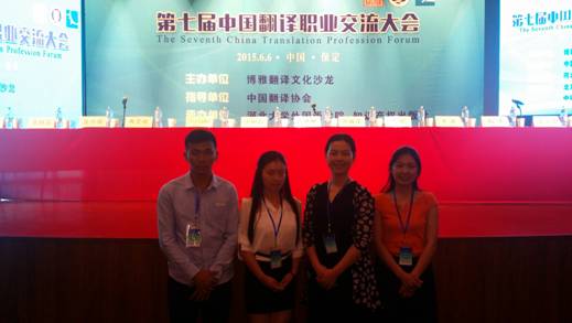 6月6日,第七届中国翻译职业交流大会于河北大学新校区如期召开。为加深学生对翻译行业的了解,认识专业翻译教育现状,我校76net必赢线路检测中心曹瑞斓老师带领来自本学院的3名同学共赴保定参加本次交流会。会议期间,曹瑞斓老师就学院商务英语专业硕士学位点申报材料的准备情况,向与会的中国商务英语研究会常务副会长,教育部商务英语国家级教学团队负责人,对外经济贸易大学英语学院院长王立非教授进行了汇报。王教授对学院商务英语专业硕士学位点的申报工作给予了肯定,并就此次申报提出了指导意见。