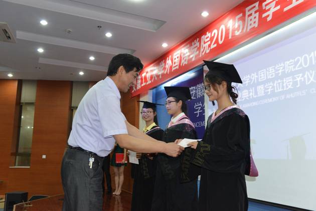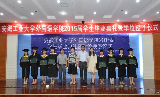 随后,毕业生典礼暨学位授予仪式在雄壮的国歌声中拉开序幕,学院党委书记宋洪生宣读了学院2015届安徽省品学兼优毕业生和2015届bwin必赢线路检测优秀毕业生的表彰决定。导师代表英语系副主任马广利博士,毕业生家长代表朱寒霜同学的父亲,毕业生代表赵继敏,在校生代表王敏先后发言,他们的发言充满了对安工大的感激之情,对母校的依依不舍,对毕业生的深深祝福。76net必赢线路检测中心院长洪流宣读了2015届毕业生中获文学学士学位同学名单。