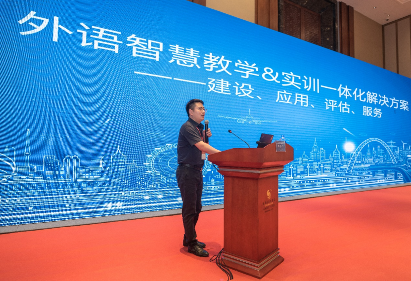 安徽译创语言服务有限公司执行总监朱小二作了题为“外语智慧教学实训一体化解决方案”的主旨报告,介绍了目前外语教学实践基地建设所涉及的主要外语教学类产品,从软硬件建设的环境和条件、基地建设方案设计原则、总体设计的应用场景等方面详细阐述了实训基地建设思路。
