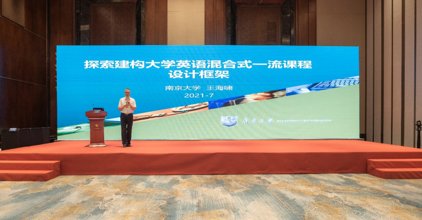 南京大学资深教授、外国语言学及应用语言学专业博士生导师,现任教育部高等学校大学外语教学指导委员会委员,全国大学英语四、六级考试委员会委员,江苏省高等学校外国语教学研究会会长,江苏省外国语言学会副会长,中国英语教学研究会计算机辅助外语教学专业委员会副主任委员王海啸教授作了题为“探索构建大学英语混合式一流课程设计框架”的专家主旨报告。王教授的报告既有理论阐释,又有实践力证。他从课程设计的基本原则入手,结合混合式学习以及大学英语教学的特点,系统阐述了由“教学目标”、“教学组织”和“教学评价”三大模块有机组成的大学英语混合式一流课程总体设计框架,对大学英语课程建设与教学改革具有重要的指导意义。