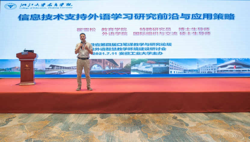 浙江大学教育学院教育技术专业特聘研究员,博士生导师翟雪松教授作了题为“信息技术支持外语学习研究前沿与应用策略”的专家主旨报告,以自身经历建议大家多参会,主动学习,坚持不懈地为自己的研究兴趣点努力,结合案例说明要有问题意识,注意研究方法,明确研究类别,围绕研究对象,深化研究过程,从而实现外语教学与教育信息技术的有效结合。