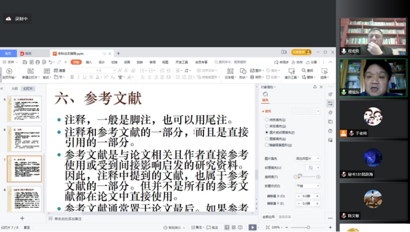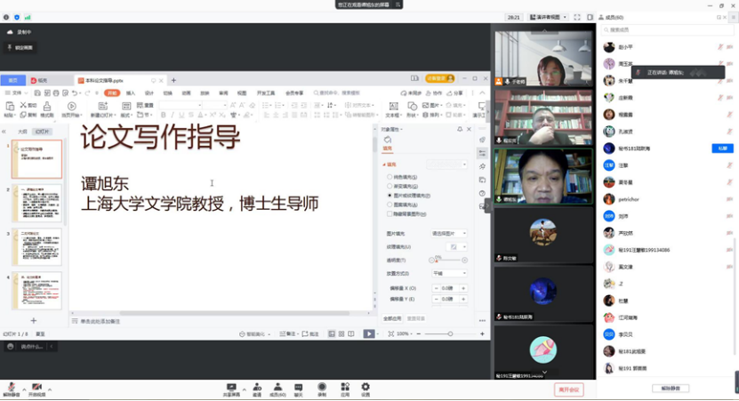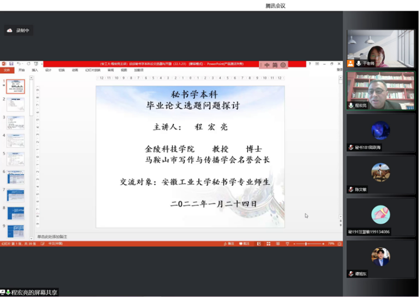 1月24日下午2点30,76net必赢线路检测中心采用腾讯网络视频会议的方式,邀请了上海大学文学院创意写作博士点负责人、创意写作与儿童文学博士生导师、博士后合作导师谭旭东教授和金陵科技学院秘书学专业学科带头人程宏亮教授就秘书学专业学士学位论文写作与选题给予指导。会议由秘书学专业的任课教师于春莉主持,76net必赢线路检测中心曹瑞斓院长和教学副院长陈琳出席会议,全体秘书学专业师生聆听讲座。
