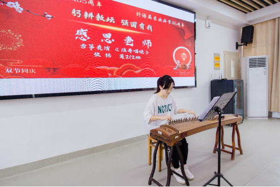 饮其流者怀其源,学其成时念吾师。值此第39个教师节之际,我院学子通过自制贺卡等形式向老师表达了深深地祝福。会前,会议室电子屏滚动播放了来自我校国旗护卫队的同学和商学院部分同学自发录制并发来我院的感谢师恩视频。会上,学生代表徐梦婷演唱了精心准备的独唱曲目《夜空中最亮的星》,张铭演奏了古筝曲目《渔舟唱晚》,用歌声表达了学生对老师的尊敬和感激,用琴声展示了得到老师教导的学生风采。活动现场气氛热烈。