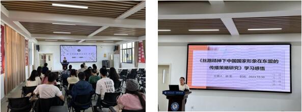 汇报会由2023级三位研究生同学分别分享读书体会。翻译专业研究生张雅静的题目是“读《词语翻译丛谈》有感”,她主要聚焦于颜色词和简化词的翻译,讨论了翻译颜色词的五种方法两种策略,以及简化词的三个维度和七种方法。翻译专业研究生王娜分享了《国外翻译理论研究》读后感,她通过介绍国外翻译理论的内容和发展,重点阐述了本雅明的纯语言和可译性,从中探讨译者的任务和作用。商务英语研究专业研究生郭荣从《丝路精神下中国国家形象在东盟的传播策略研究》谈学习感悟,她从书本内容、框架开始介绍,着重讲述了“国家形象”和丝路精神这两个话题,探讨“一带一路”建设十年来为我国国家形象国际构建做出的突出贡献。