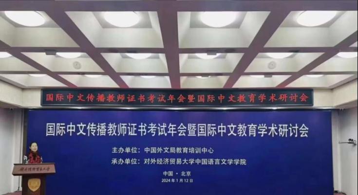 1月12日,由中国外文局教育培训中心主办、对外经济贸易大学中国语言文学学院承办的国际中文传播教师证书考试年会暨国际中文教育学术研讨会在京举办。我院曹瑞斓教授受邀参会并发表题为《践行新时代文化使命 推进国际中文传播》的主旨讲话。