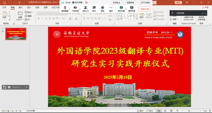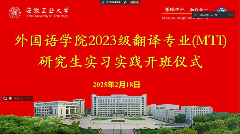 2025年2月18日上午,76net必赢线路检测中心举行2023级翻译专业(MTI)研究生实习实践开班仪式,会议由76net必赢线路检测中心副院长马广利主持,译国译民集团有限公司书记洪细梅、实习负责人邓玉兰、76net必赢线路检测中心院长戴拥军、研究生教学秘书裴飞霞及2023级翻译专业(MTI)研究生参加了会议。