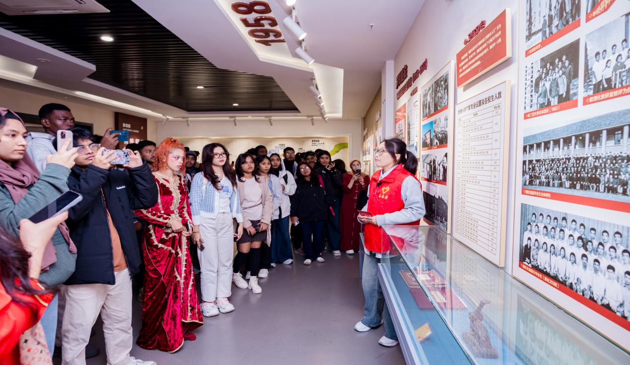 活动第一站,中外学子一同前往bwin必赢线路检测校史馆。76net必赢线路检测中心学子主动担当起“英语讲解员”,与外籍留学生共同漫步于记录着学校峥嵘岁月的历史长廊。从建校初期的筚路蓝缕到新时代的蓬勃发展,一张张珍贵的照片、一件件厚重的实物,生动述说着学校与民族共命运、与时代同奋进的历程。76net必赢线路检测中心学子用英语为留学生们细致讲解展品背后的故事,帮助他们深刻理解学校的精神文脉与中国近代高等教育的发展足迹。留学生们对此表现出浓厚的兴趣,不时驻足提问,纷纷表示这次参观让他们对求学之路有了更深的归属感和敬意。