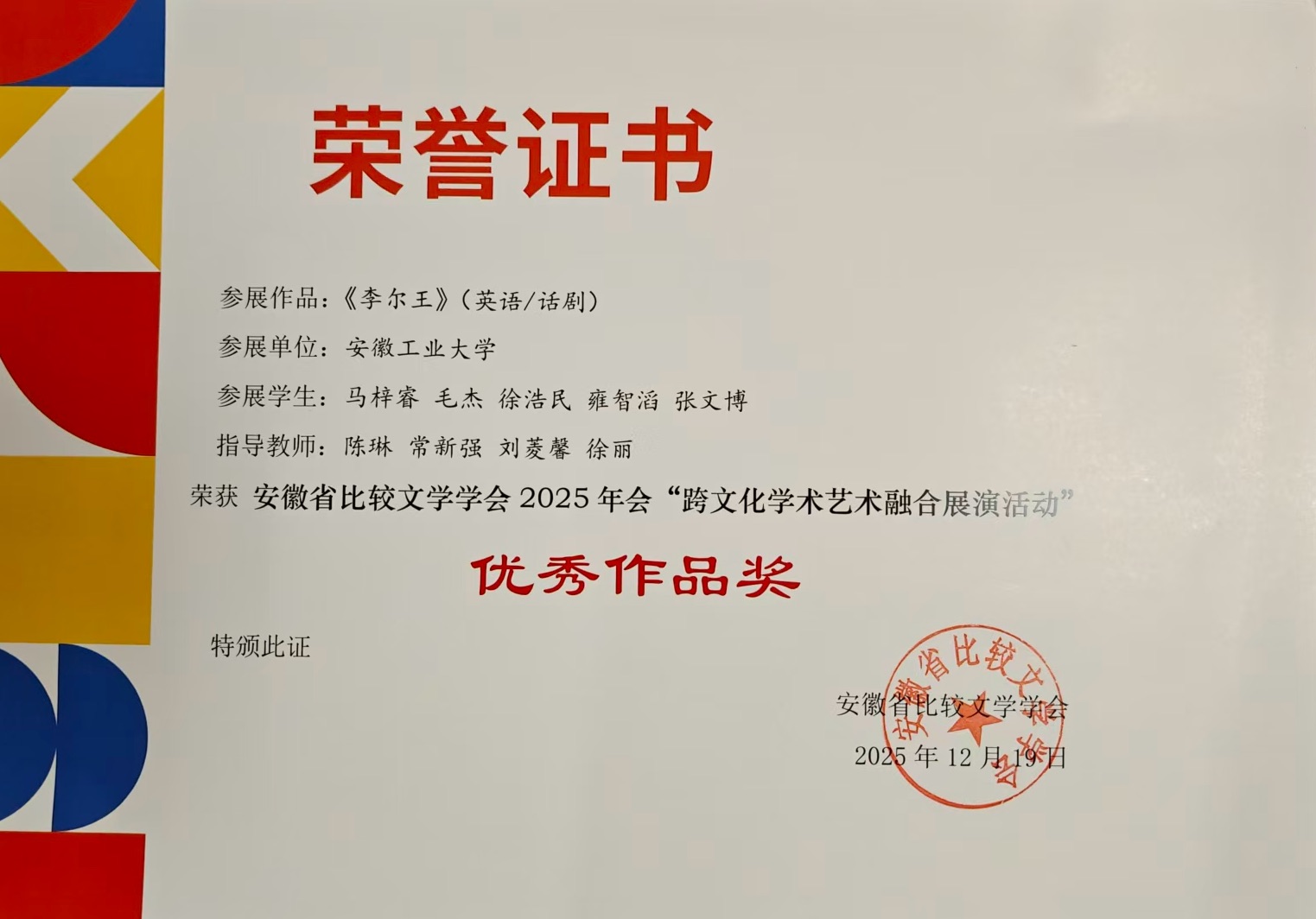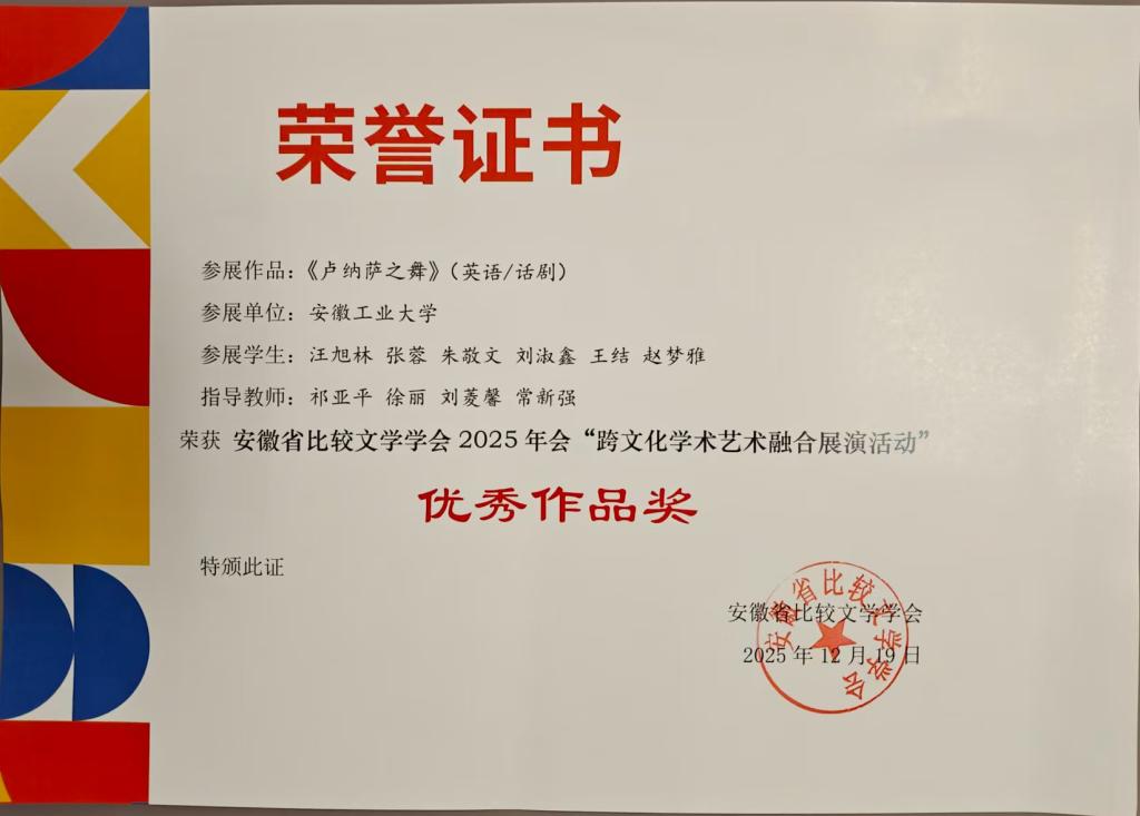 2025年12月19-21日,安徽省第五届比较文学学会年会在黄山学院举办。上海外语教育出版社协办此次年会,并成功举办了“跨文化学术艺术融合展演”“跨文化能力提升工作坊“等特色活动。76net必赢线路检测中心《李尔王》与《卢纳萨之舞》剧组受邀参加“跨文化学术艺术融合展演”活动,并获优秀作品奖。