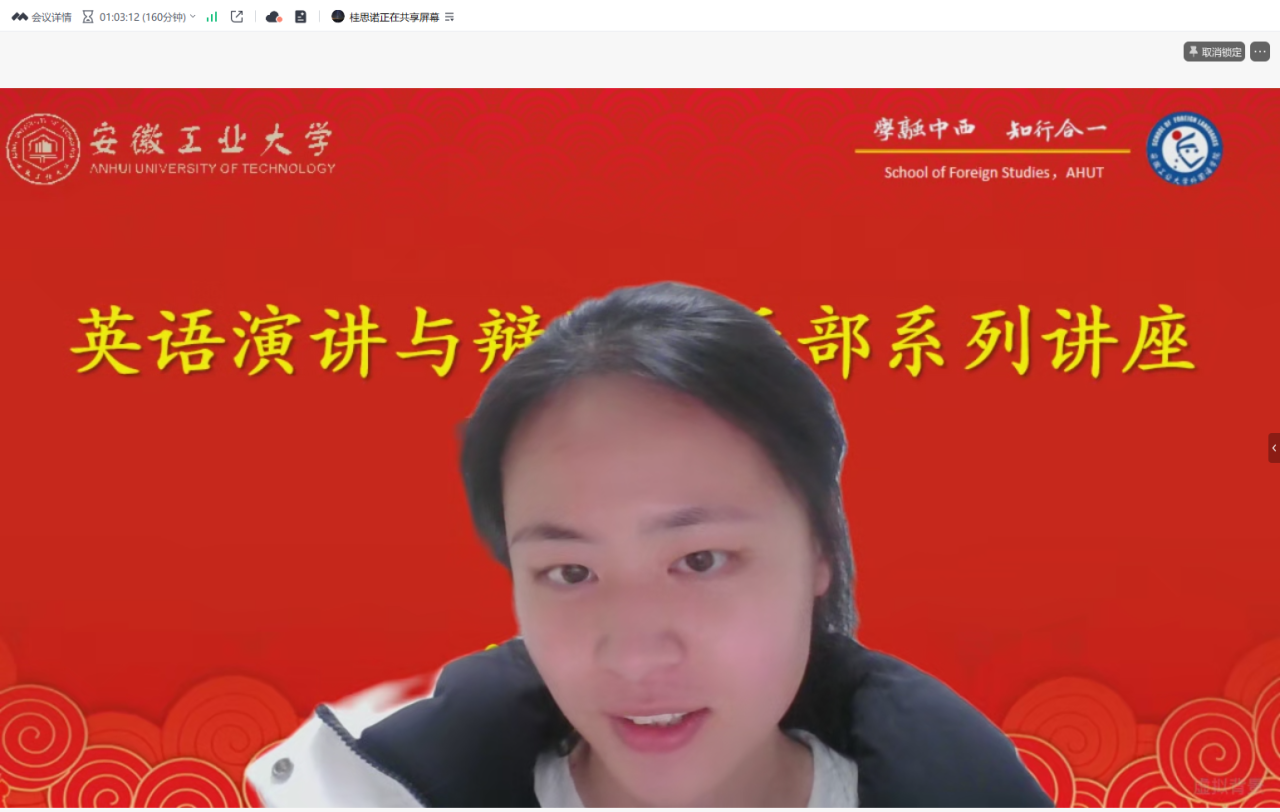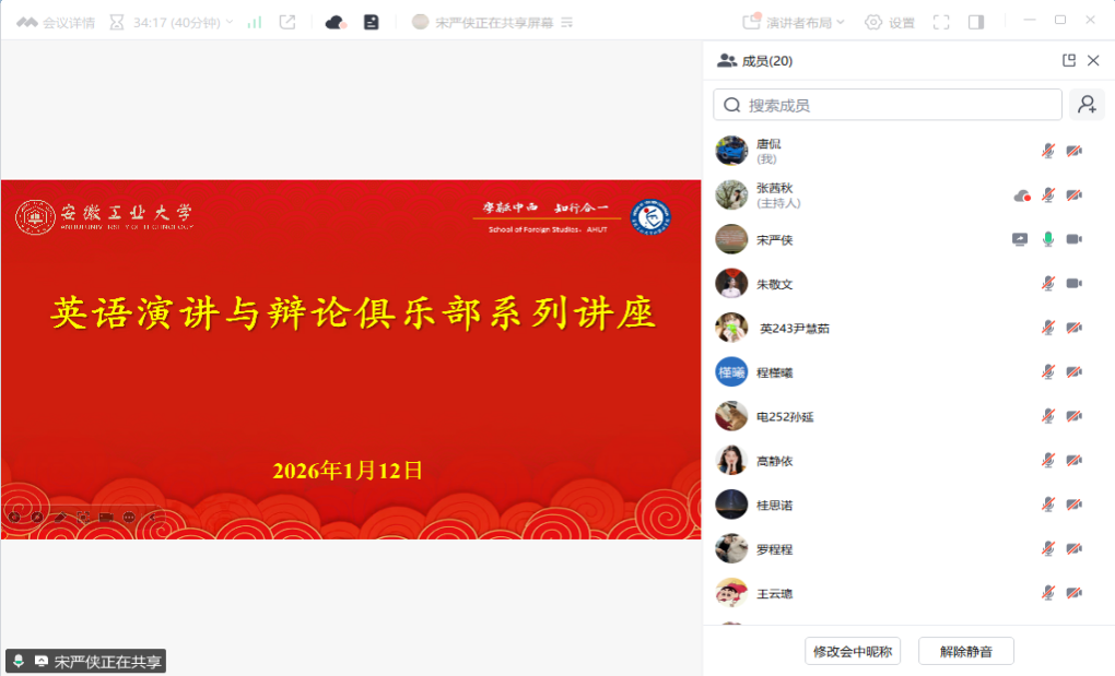 为帮助学生精准把握外研社国才杯“理解当代中国”全国大学生外语能力大赛核心要求、积累实战备赛经验,进一步提升外语综合素养与赛事竞争力,1月12日晚,英语演讲与辩论俱乐部寒假系列首场讲座在腾讯会议平台正式展开。俱乐部理事宋严侠老师,三位优秀选手桂思诺、朱敬文、周冉等在会议上做讲解和分享;俱乐部多位理事、来自不同年级的俱乐部成员及其他同学积极参与本次讲座,76net必赢线路检测中心陈琳副院长参会。