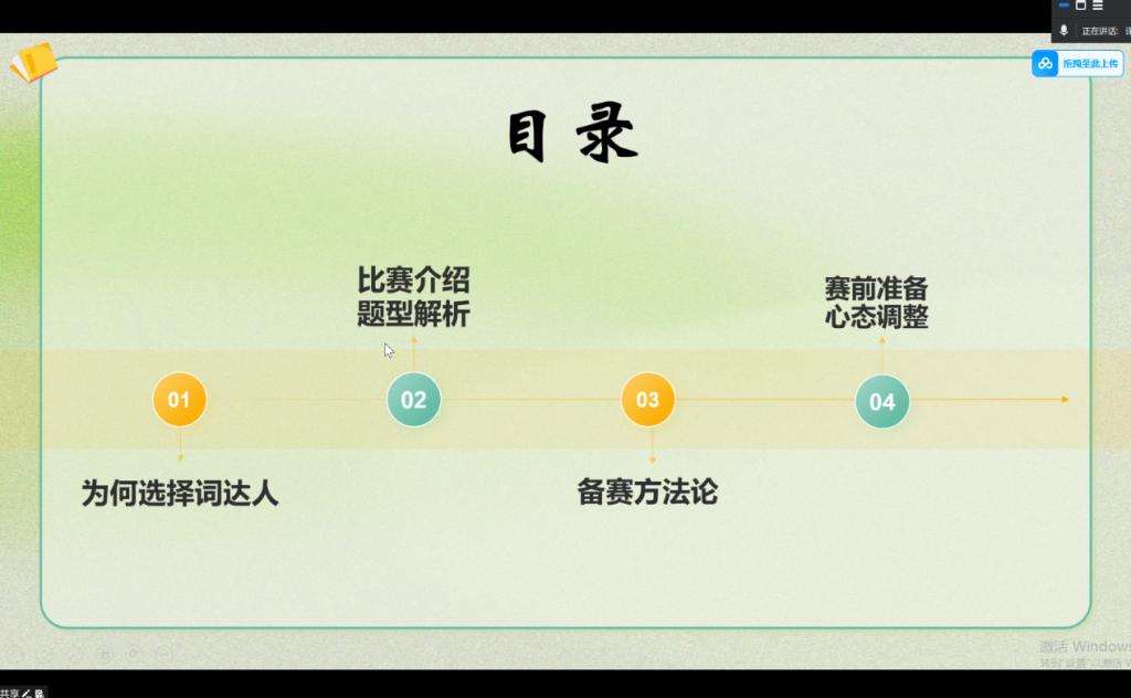 刘志莹同学结合自身参赛经历,从赛事选择、比赛流程、题型解析、备赛方法、赛前准备及心态调整等方面进行了全面分享,为同学们提供了实用备赛建议。