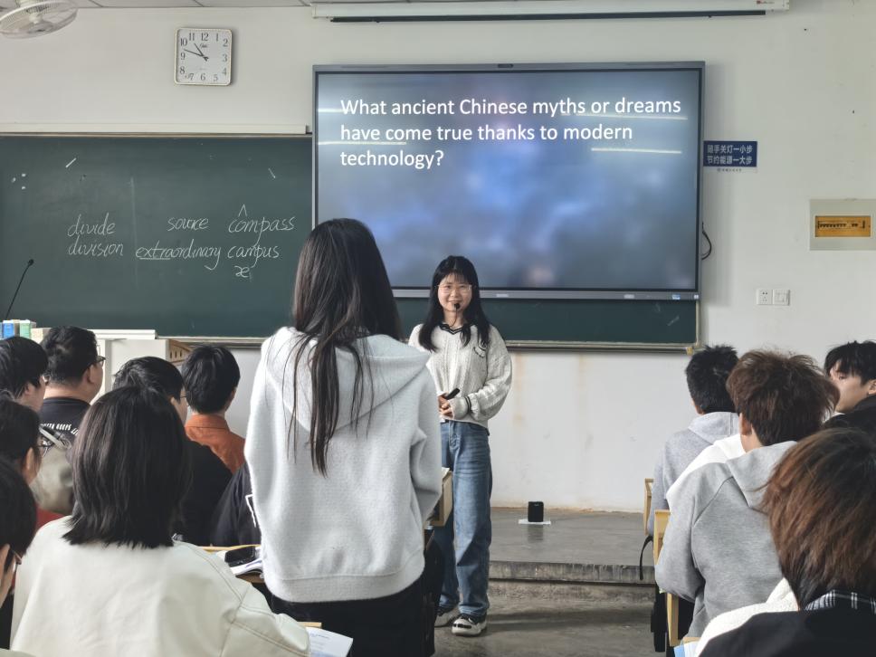 课堂开篇以“古今梦想照进现实”为切入点,范昆盟娓娓道来古代中国人对美好生活与未知世界的畅想,引导同学们思考:哪些古代神话已通过现代科技成为现实?同学们踊跃发言,分享了千里眼、顺风耳、腾云驾雾等神话的现代科技实现形式,并提及祝融火星探测器等重大成果。随后,范老师通过视频带领同学们回顾中国古人在机械科学领域的辉煌成就,组织相关课堂练习,细致讲解重点语言知识点。在“除机械领域外,古代中国人还取得了哪些重大成就”的主题探讨中,同学们各抒己见,从天文、医药、农业、建筑等多维度分享古代文明成就,在思想碰撞中加深了对中华优秀传统文化的认知。