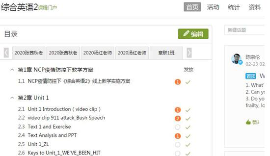 本次疫情背景下的线上教学促使综英课程组教师迅速掌握了包括录屏、教学平台操作等在内的线上教学技术,学会了进一步挖掘各大平台本身提供的众多优质教学资源,为我所用,并设想以此为契机,进行教学方式和观念从以教师为中心向以学生为中心的转变。一个月后课程进入课文讲解阶段,课程组计划将“爱课程”平台上国家精品资源共享课教学视频作为课程学习的主渠道,以翻转课堂的方式,变教师主讲、学生聆听为教师讲授为辅、解答学生问题为主。(撰稿:宁静;审核:陈琳)