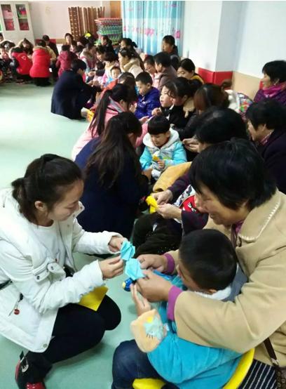 11月25日上午,76net必赢线路检测中心中文系党支部书记于春莉博士、 “心灵雨露”关爱脑瘫儿童志愿服务队、“英语角协会”会员一行来到马鞍山市残疾人联合会,在市残联康复中心,与近50名脑瘫儿童和他们的家长围坐在一起,举办“感恩”主题日活动,每名孩子的身边都有一位大学生志愿者拉着孩子的手。