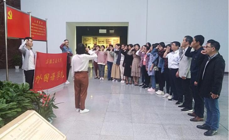 在陈列馆大厅,全体党员面对革命先辈的雕塑、面向党旗重温入党誓词,表达自己传承红色基因和对一名共产党员理想信念的坚守。