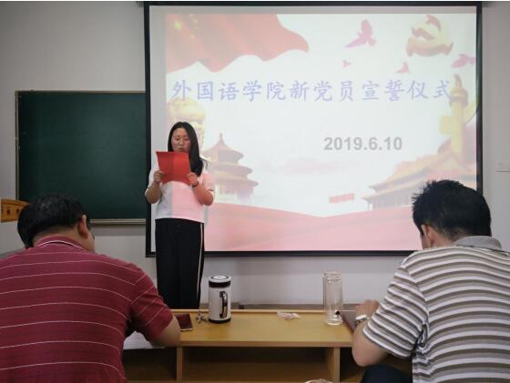 仪式上,英语161班彭菊萍、英语151班朱龙凯分别代表新发展党员和正式党员发言。
