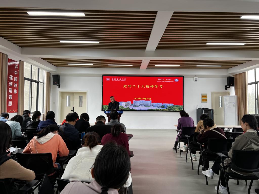 院党委副书记、院长曹瑞斓通报布置了学院教学、科研和社会服务等工作。她指出,在党的二十大胜利召开之际,在党和国家对教育、科技和人才以及推动中华文化更好走向世界的工作部署中,全院教职工要坚持为党育人、为国育才,加强课程思政,推进三进教学工作,在已有工作成果基础上,继续深化和拓展服务学校学科建设的校本特色大学英语教学改革,加强以国家级一流专业建设为契机的英语类专业建设,做优语言文学学科建设、硕士学位点建设和高水平人才培养,更加紧密地与地方政企联系并投身语言服务产业事业建设,坚定信心、同心同德,埋头苦干、奋勇前进。