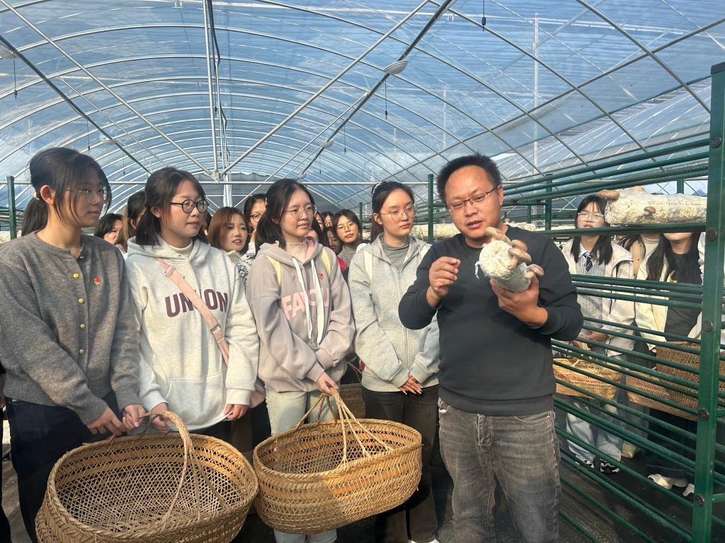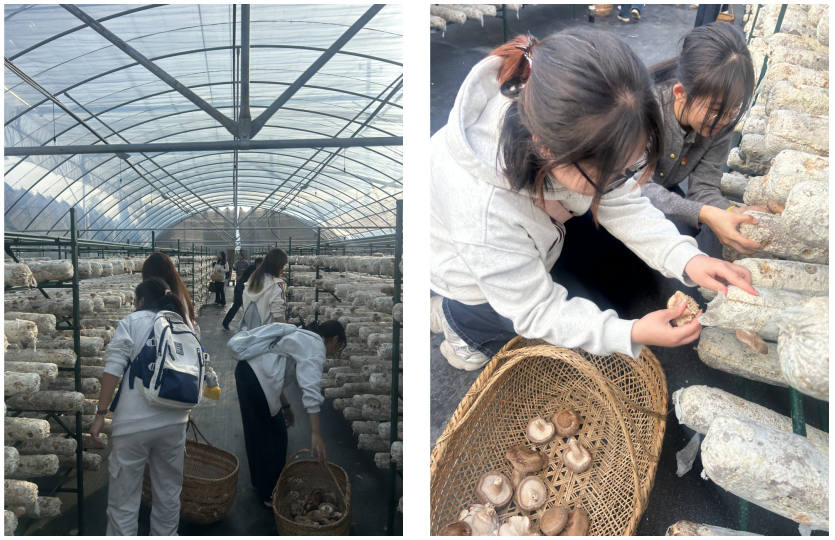 在香菇种植大棚内,驻村书记黄宁辉为党员和学生们系统讲解了从培育、采摘、分选到销售的全程技术要点,生动阐释了兴圩村发展特色产业、赋能乡村振兴的实践路径。经过现场培训,大家迅速掌握了香菇采摘的技巧。菌棚内,同学们分工协作,有的细心寻找、轻巧采摘,有的则将满载的菌筐接力传递,及时运送至烘烤室。整个流程秩序井然,大家在躬身劳作中体会农事艰辛,在默契配合里感受振兴脉动,既体验到收获的喜悦,也展现出昂扬向上、务实肯干的精神风貌。