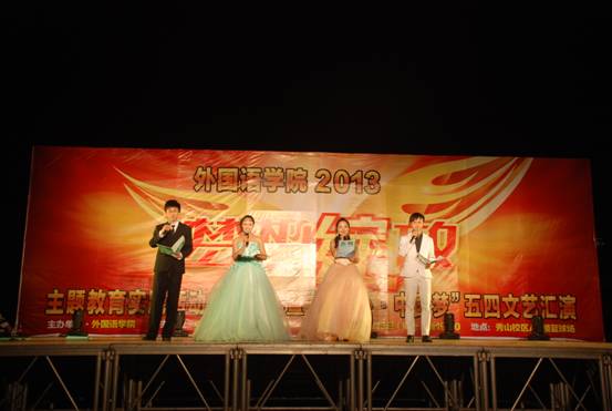 接下来的文艺汇演在热情洋溢的开场舞《Hello Youth》中正式拉开帷幕,由毕业班选送的女生独唱《My Heart Will Go On》、器乐联奏《画境》接连上演,将晚会的气氛逐渐带向高潮。由英语112班选送的配乐诗朗诵——祈福雅安《Mom Don’t Cry》,真情流露,不禁让人热泪盈眶。接下来的小品《竞选》、拉丁舞《琴语》更是精彩不断,赢得场上阵阵掌声。戏曲大擂台《当林妹妹遇上女驸马》,经典黄梅戏,唱响安工大,令人心驰神往。轻舞飞扬《梦回兰亭序》轻灵曼舞、模特秀《Make Romance》动感十足。紧接着的民歌风采《军民情,中国心》,一首首经典红歌,唱响中国梦,抒发报国情。心理话剧《山路》描述的当代大学生主动放弃都市生活,克服种种困难,乐于奉献西部支教的感人事迹,给在场所有观众又一次的无言震撼。最后,本场晚会在大合唱《仰望星空》中圆满落下帷幕。