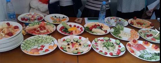 此次比赛的规则是以寝室为单位,宿舍成员团结协作,共同完成一份作品,并派出一位代表将其展示给评委,进行创意描述。此次创意DIY水果拼盘比赛共有18个寝室参加,她们为我们带来了新颖独特,色彩斑斓的佳作,水果拼盘的主题涉及也十分广泛。一道道创意作品让评委和观众们耳目一新,精彩的创意描述更让人连连称赞:春暖花开、不一样的美果子、清凉一夏、五月的花海等极具创意的主题,均巧妙地利用了当下时令的新鲜蔬果,也许,日常中,它们只是平凡不过的营养果品,一番心思加工之后,却如同一幅春天的画卷摆在眼前。一番激烈的展示角逐之后,其中D219荣获一等奖,D107、D218荣获二等奖,D115、D109和C133荣获三等奖。