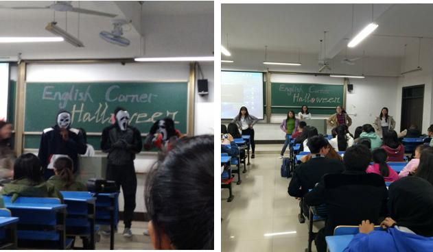 活动以契合主题的英文电影开幕,电影精彩处,留学生们打扮成各色鬼怪由后门悄悄步入,口语交流正式开始。游戏环节——“Truth or Death”是此次活动最考验会员口语水平的环节,紧张的氛围中,会员们忘却了口语交流中的腼腆,穷尽其辞,努力用自己的词汇量做出最贴切的表达。随后留学生表演了具有中国时代特色的《青春修炼手册》、凤凰传奇歌舞节目,中国学生则表演了西方歌舞,现场气氛热烈。
