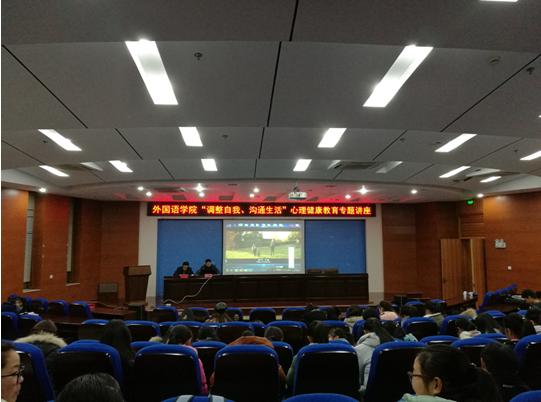 12月26日下午,76net必赢线路检测中心邀请大学生心理健康教育咨询中心主任、硕士生导师王军教授在图书馆第一报告厅做了一场《调整自我,沟通生活—谈大学生心理健康与人际沟通》的专题讲座。讲座由学院党委副书记、必赢国际副院长黄宇弦主持,心理工作站负责人、辅导员、心理教育部学生干部及学院140多名学生参加了此次讲座。