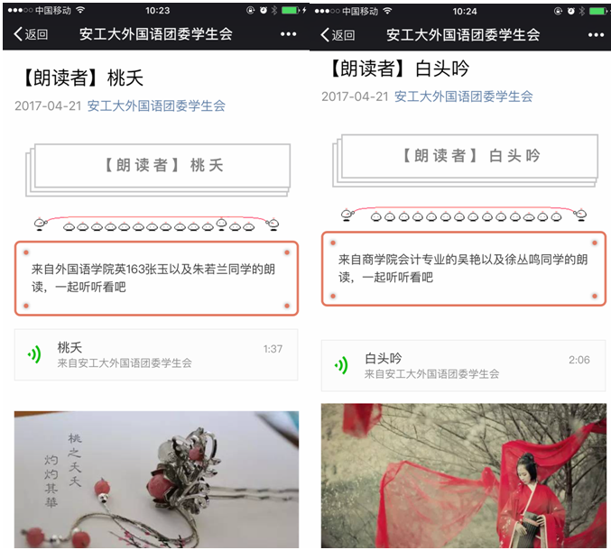 艾默生说“读书时,我愿在每一个美好思想的面前停留,就像在每一条真理面前停留一样”,在4月23日世界读书日之际,76net必赢线路检测中心推出一系列朗读经典活动,邀请各个学院的优秀学子用中英双语,朗读经典,在76net必赢线路检测中心团委学生会微信公众号(ahutwgy)推送,打造了一个微信版工大“朗读亭”。