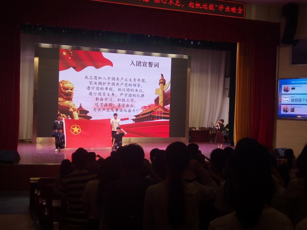 仪式开始第一项奏唱国歌,全体同学起立将手放置胸前团徽处,庄严高歌。第二项奏唱团歌,在团歌渲染的庄严气氛中,团委书记徐晓寒带领全体共青团员,面对鲜红的团旗,高举右拳,重温了入团誓词,再次接受了一次思想洗礼。“我宣誓:我志愿加入中国共产主义青年团,坚决拥护中国共产党的领导,遵守团的章程,执行团的决议,履行团员义务,严守团的纪律,勤奋学习,积极工作,吃苦在前,享受在后,为共产主义事业而奋斗!”的铮铮誓词震撼人心。