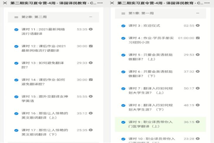 本次实习活动以译国译民的教师定期录播课程为主,同时还邀请很多行业大咖,如北外高翻院李长栓教授,福建师范大学翻译博导岳峰教授,中国翻译协会理事穆雷教授进行直播授课。学员们在课程结束后,完成相应的课后作业和测验,当学习进度达到标准时,可以获得实习证明。实习课程安排松弛有度,所讲授的知识覆盖面广、有深度,既有翻译行业的基本情况和如何进行大学生涯规划,又讲述了趣味热点翻译。这次活动,学员们将自己的专业知识与暑期社会实践相结合,在实习中不断锤炼翻译技能,加强口笔译能力学习,向着高复性翻译人才迈进。