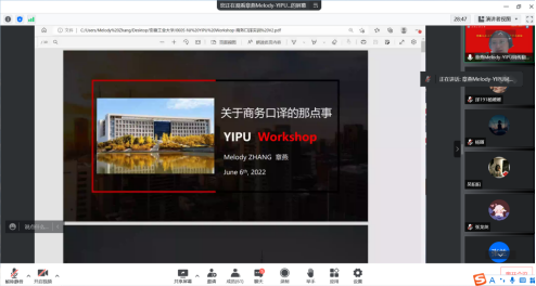 为加深学生对国内外商务口译动态的了解,促进学生对商务口译基本方法的学习,加强知识、技能与实际操作的联系,76net必赢线路检测中心于6月6日晚举办商务口译专题讲座,特邀南京译·朴工作室创始人章燕主讲,翻译专业本科生及研究生参加了会议,讲座由76net必赢线路检测中心副院长戴拥军主持。