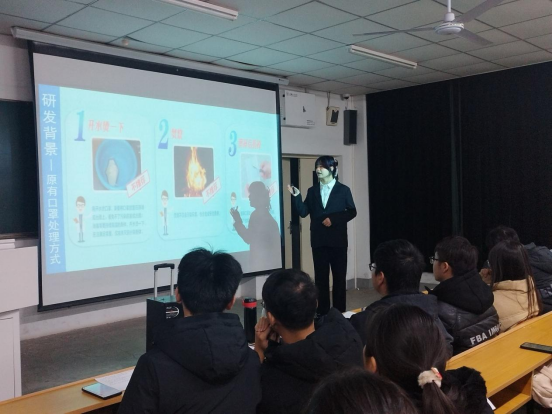 参赛人员利用PPT进行挑战杯宣讲。答辩过程中,参赛团队分别从项目来源、项目实施、研发等多方面进行讲解,逻辑严谨周密,举止从容大方,展现了外院学子的风采。针对参赛团队的项目和答辩内容,评委做出了详尽客观的点评,给出了宝贵建议,指导参赛选手如何完善创意以及今后项目改进的目标方向,为参加校赛奠定基础。