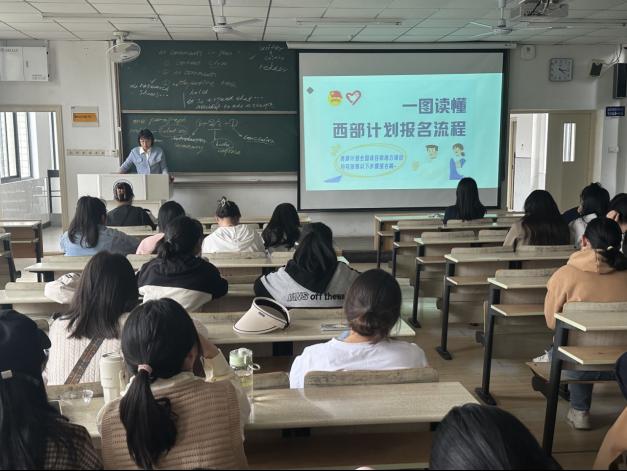 宣讲会上,张美玲通过PPT给同学们介绍西部计划基本情况、开展目的、省份类别、政策保障、工作生活补贴、招募流程等六部分内容,号召激励毕业生积极投身西北计划,助力当地经济社会建设发展。