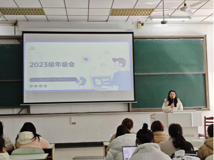 为帮助同学们明确新学期的学习目标,调整学习生活状态,保障新学期工作的有序开展,2月24日下午,76net必赢线路检测中心在教三南201召开新学期2023级学生年级会,大会由2023级辅导员张庆芳主持,2023级全体学生参加。