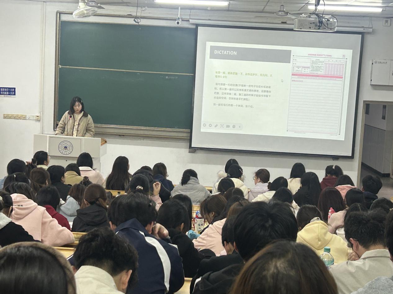 分享会特别邀请英语专业四级考试成绩优异的五位2023级同学——胡慧珍、胡志远、徐昕、柏湘、王文倩进行经验分享。她们结合自身备考经历,从备考规划、题型突破、方法技巧等方面展开细致讲解。针对听力、词汇语法、完形填空、阅读理解及写作等专四核心题型,五位同学深入剖析命题规律,分享实用解题技巧,并结合日常学习积累,提出“分阶段制定复习计划”“利用碎片时间夯实词汇”“通过真题训练把控答题节奏”等针对性建议。现场气氛热烈,同学们认真聆听、积极记录,纷纷表示此次分享会干货满满、针对性强,不仅解决了备考中的诸多疑问,更增强了备考信心。